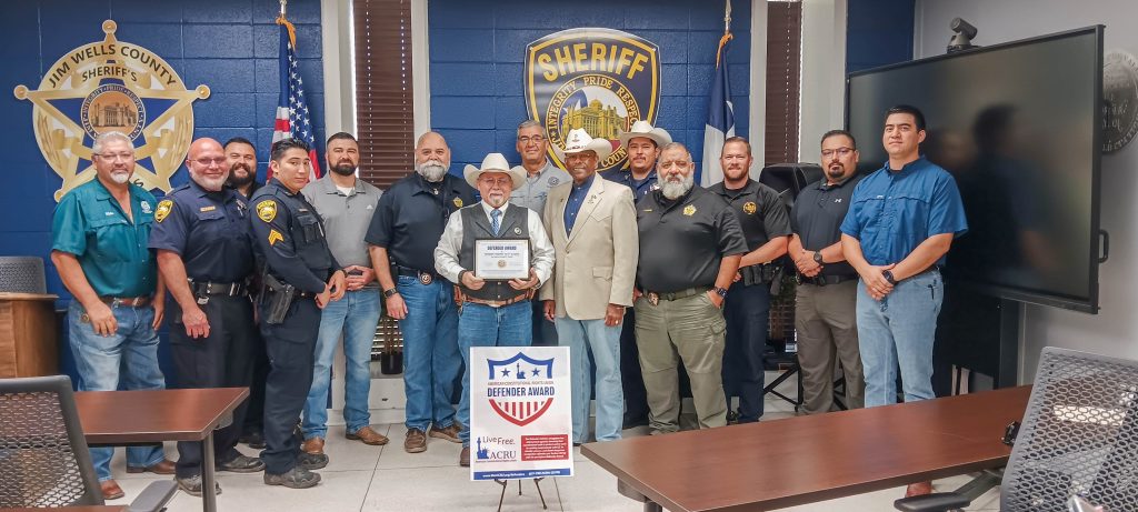 The American Constitutional Rights Union (ACRU) has recognized Sheriff Joseph “Guy” Baker, Jim Wells County, as the recipient of ACRU’s prestigious Defender Award. This honor is awarded to law enforcement leaders who honor their constitutional oath to protect and to serve by working cooperatively with U.S. Immigration and Customs Enforcement (ICE) to protect legal, law-abiding citizens from criminal illegal aliens.